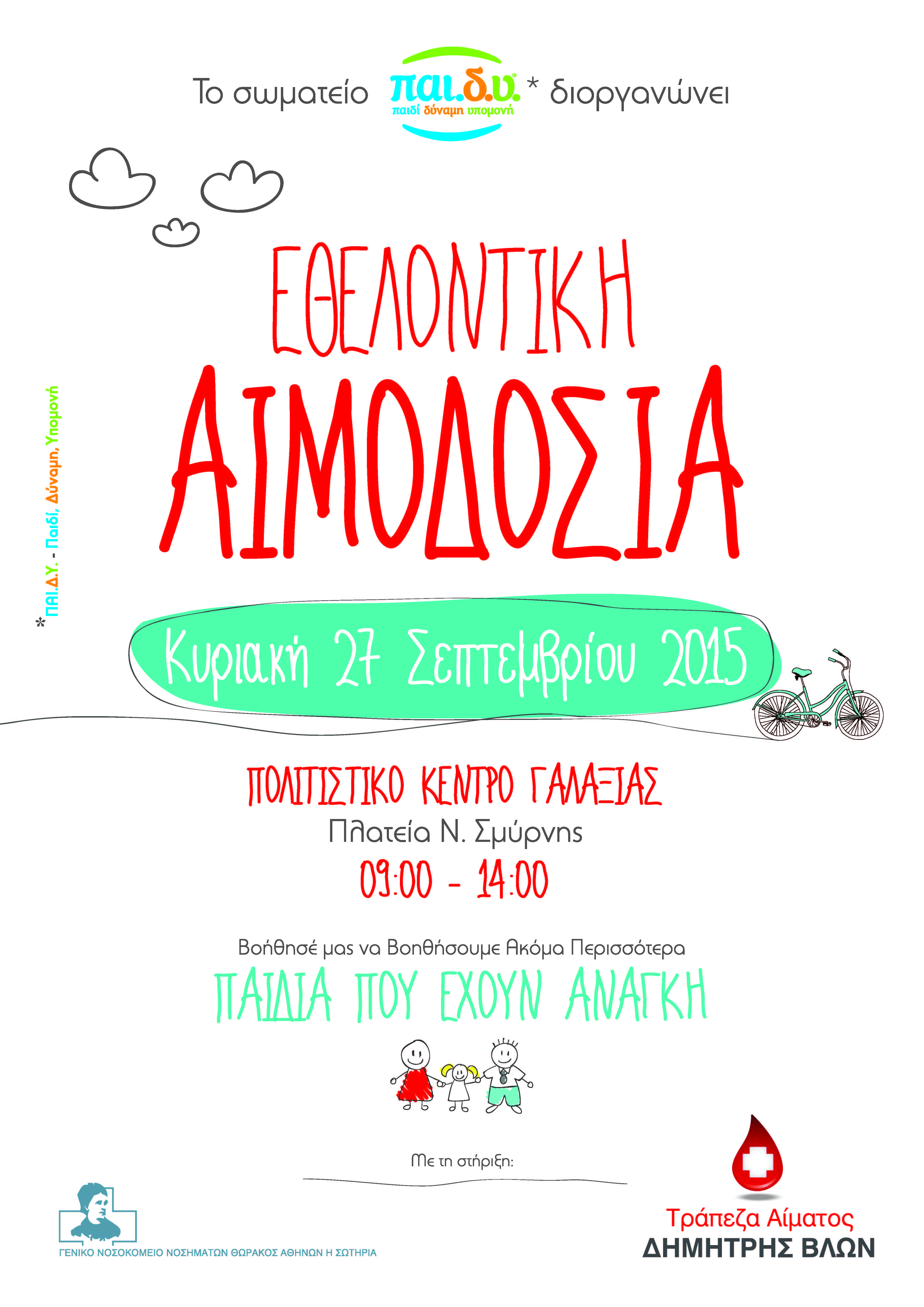 Την Κυριακή 27 Σεπτεμβρίου, 09:00 έως 14:00, το κλιμάκιο Αιμοδοσίας του Νοσοκομείου ΣΩΤΗΡΙΑ και οι διαχειριστές της Τράπεζας Αίματος ΔΗΜΗΤΡΗΣ ΒΛΩΝ, θα είναι κοντά μας, στην 2η Εθελοντική Αιμοδοσία, που διοργανώνουμε, στο Πολιτιστικό Κέντρο ΓΑΛΑΞΙΑΣ, στην Πλατεία Νέας Σμύρνης.